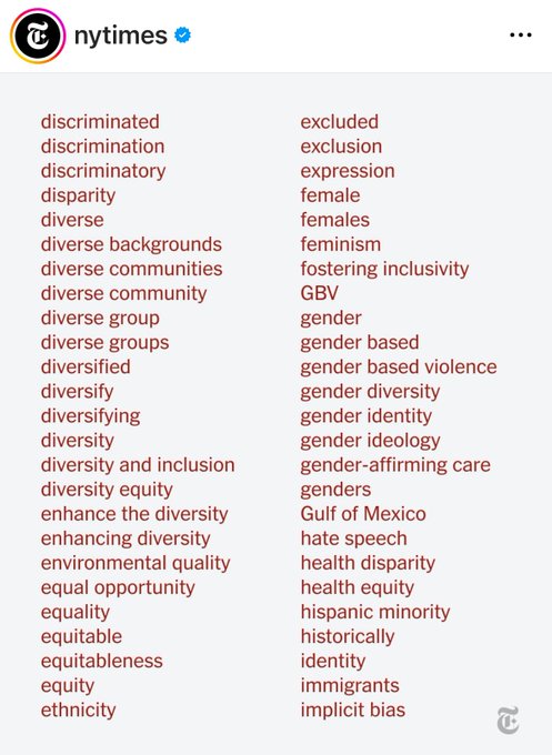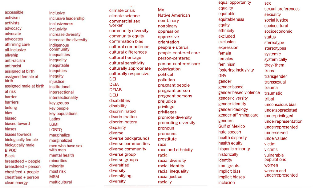 Lire l'article du New-York Times Federal agencies flag over 100 words that violate Trump’s “anti-woke” initiative. Le président Trump se présente comme un champion de la liberté d'expression, mais cette liste contredit cette notion.
