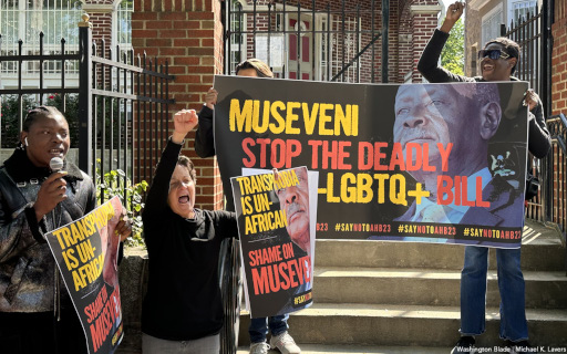 Des militants LGBTQ manifestent devant l'ambassade de l'Ouganda à Washington, le 25 avril 2023. Dans toute l'Afrique, des militants luttent contre l'influence croissante des chrétiens évangéliques américains. (Photos du Washington Blade par Michael K. Lavers)Des organisations évangéliques américaines d'extrême droite financent des députés et des groupes religieux africains et soutiennent leurs efforts de plaidoyer contre l'homosexualité.