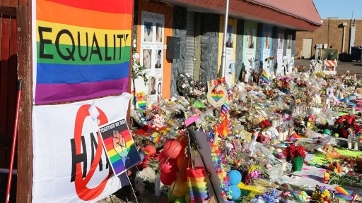 Des centaines d'objets décorent l'entrée fermée du Club Q après qu'un tireur ait pris cinq vies et blessé 18 autres personnes le 19 novembre dans ce club LGBTQ+ à Colorado Springs, dans le Colorado, en 2022.La campagne menée par l'administration Trump pour effacer la visibilité des personnes transgenres s'est étendue au domaine de la sécurité nationale, en supprimant les personnes transgenres des bulletins de renseignement fédéraux censés assurer la sécurité de tous les Américains.