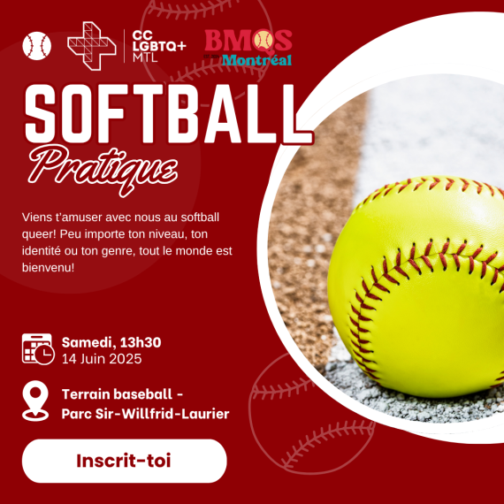 Le samedi 14 juin à 13h30, nous t'invitons à nous retrouver au terrain de baseball du parc Sir-Wilfrid-Laurier pour un après-midi de softball inclusif, convivial et festif. Cet événement, organisé en collaboration avec Balle Molle Queer Softball Montréal, est une belle opportunité de découvrir ou de redécouvrir ce sport dynamique, de rencontrer d'autres passionné·e·s, et de partager un moment fun, peu importe ton niveau ou ton expérience.