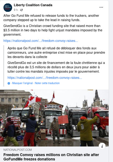 Après que Go Fund Me ait refusé de débloquer des fonds aux camionneurs, une autre entreprise s'est mise en place pour prendre les devants dans la collecteGiveSendGo est un site de financement de la foule chrétienne qui a récolté plus de 3,5 millions de dollars en deux jours pour aider à lutter contre les mandats injustes imposés par le gouvernement.L'article du National Post, relayé par cette publication nous éclaire sur la nature de ce GiveSendGo utilisé pour financer le siège d'Ottawa.
