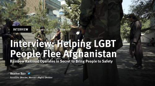 Rainbow Railroad a fourni un soutien et des conseils précieux à Human Rights Watch et à OutRight Action International pour notre nouveau rapport, "Même si vous allez dans les cieux, nous vous trouverons" : Les personnes LGBT en Afghanistan après la prise de pouvoir par les Talibans. Heather Barr, directrice associée des droits des femmes à Human Rights Watch, a interviewé Kimahli Powell, directeur exécutif de Rainbow Railroad, sur la manière dont les gouvernements peuvent mieux protéger les personnes LGBT pendant les conflits armés et les situations de crise.