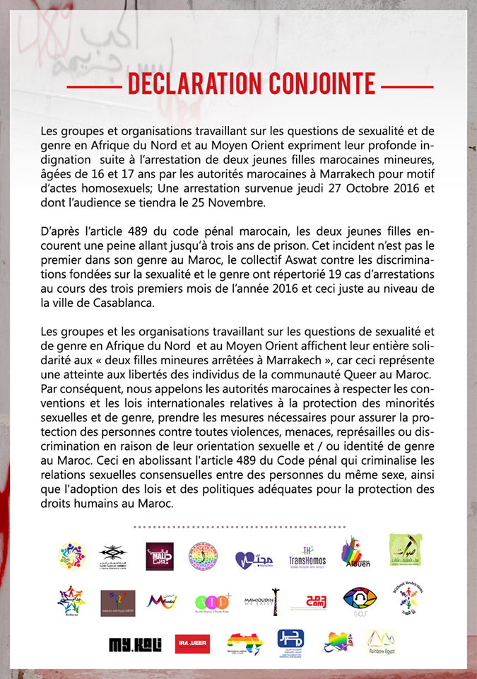 Communiqué commun des 22 collectifs et organisations travaillant sur les questions de la sexualité et du genre en Afrique du Nord et au Moyen Orient relatif à l'arrestation de deux mineures au Maroc poursuivies pour motif d'actes homosexuels.
